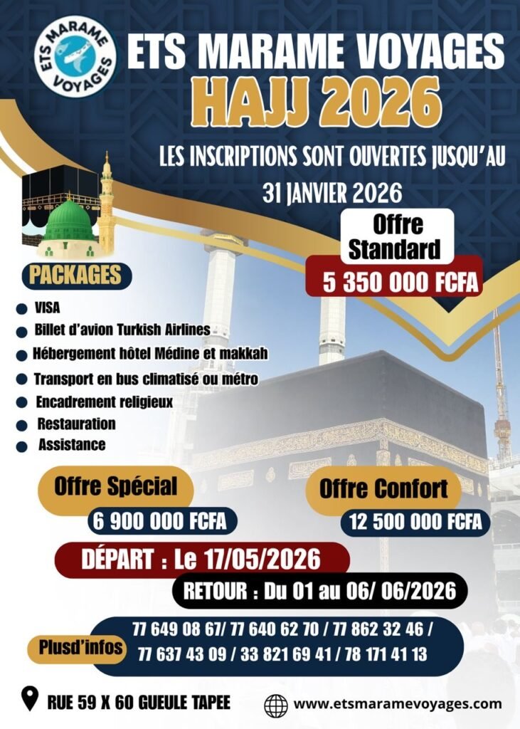 Ets Marame Voyages vous invite à accomplir le Hajj 2026 dans les meilleures conditions d’organisation, de confort et de spiritualité.
