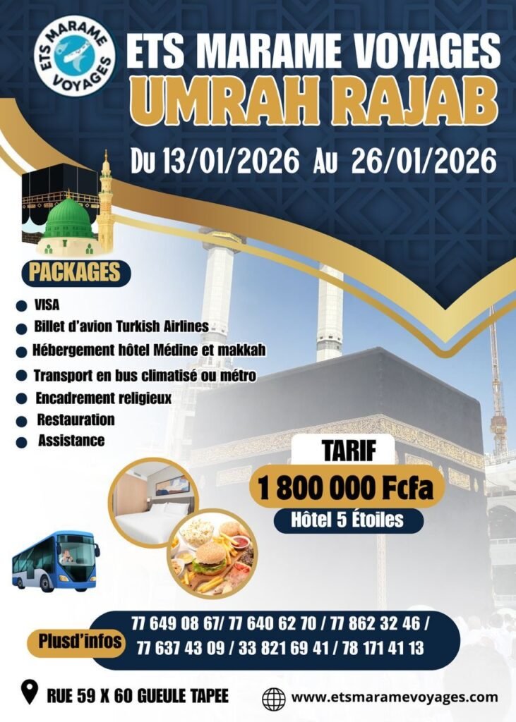 Vivez une expérience spirituelle exceptionnelle avec Ets Marame Voyages à l’occasion de la Umrah du mois béni de Rajab, prévue du 13 au 26 janvier 2026.